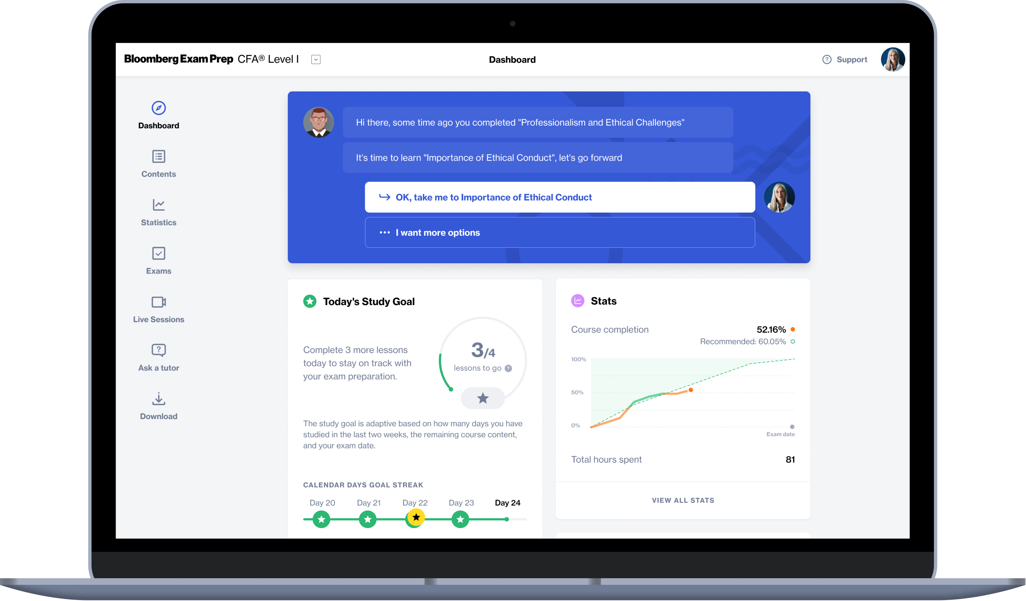 Get personal support from our elite tutors, all of them CFA charterholders. Discuss your progress and problem areas, and get personalized strategies.